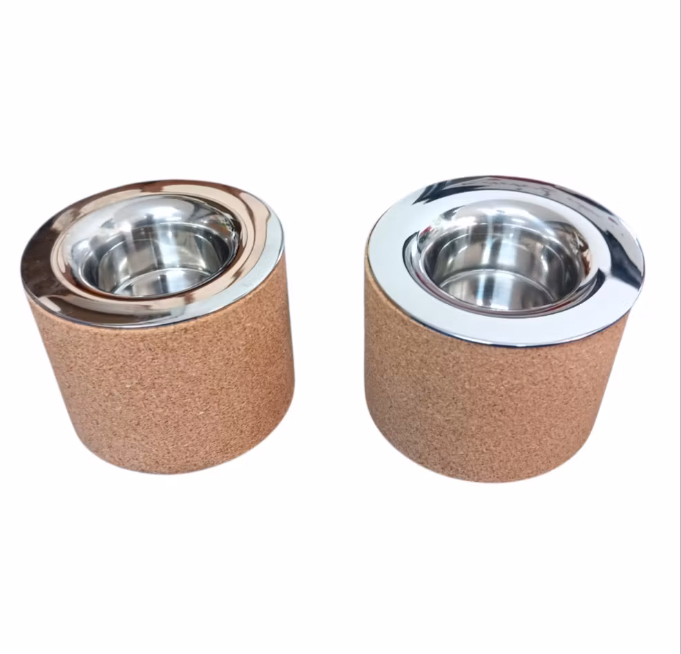 BERNADOTTE & KYLBERG Ljusstakar ,2 st, kork och stål. För värme ljus. Design Carl Philip Bernadotte och Oscar Kylberg. Höjd 6,5 cm. Oanvända i originalkartong.