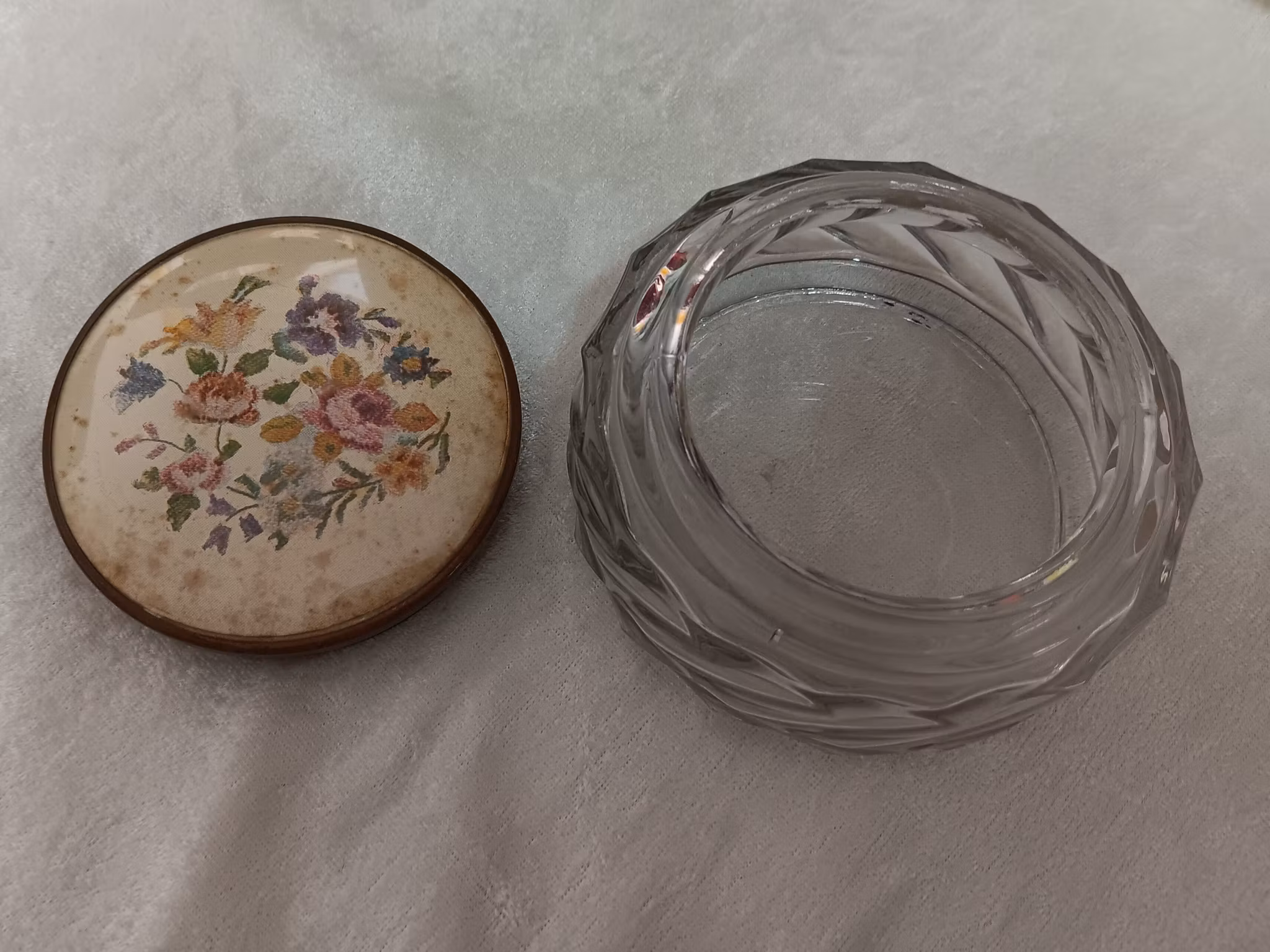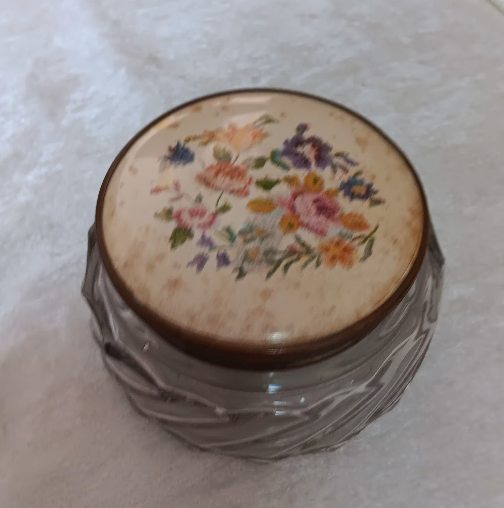 Puder burk i glas, England Vintage 55 kr Fin vintage. Puder burk från 50-talet. Tillverkad i England, har ett fin lick med blommor. Mått10 cm I dia, 6 cm hög. I lager. Lägg i korgen Dela Lagersaldo: 1 Artikelnummer: 6027 Information Fin vintage. Puder burk från 50-talet. Tillverkad i England, har ett fin lick med blommor. Mått10 cm I dia, 6 cm hög.