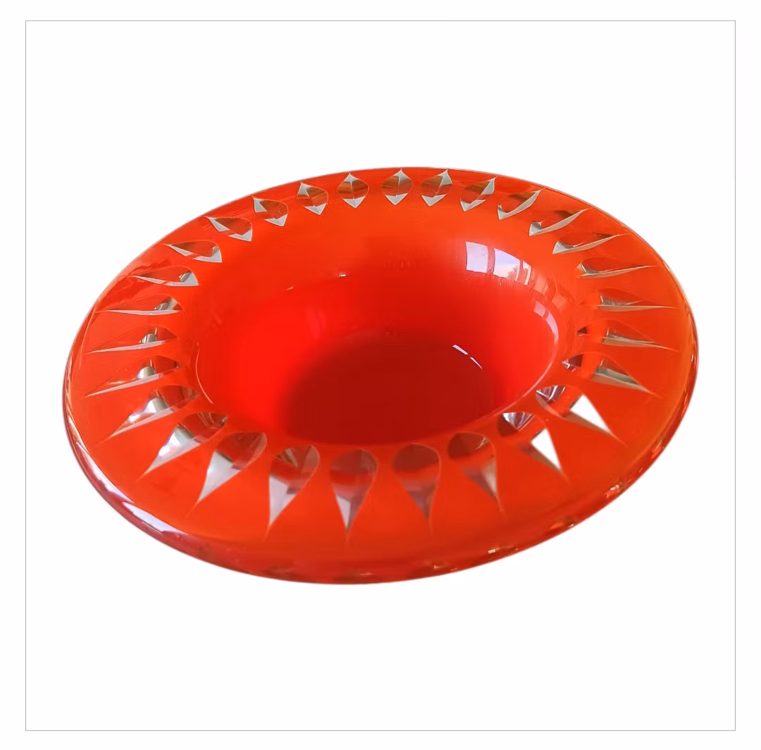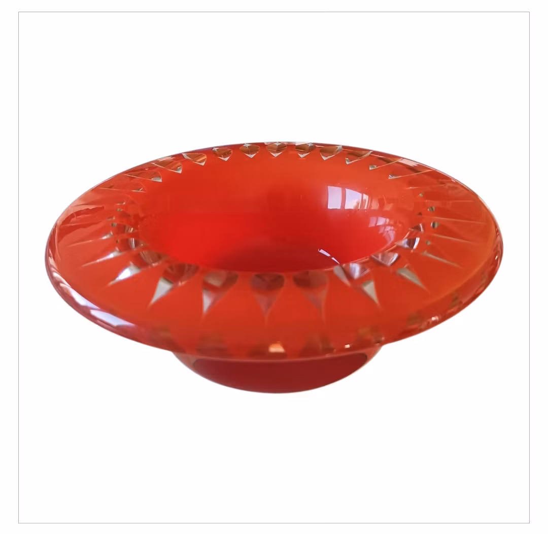 Sigurd Persson skål från Kosta 50-50-tal. Signerad. Moden skål i glas och med inslag i orange. Fint slipade detaljer. Sigurd är en svensk känd formgivare i som började sin karriär som silversmed men med tiden började han även att verka som skulptör och glaskonstnär. Sigurd dog 2003. Idag finns han representerad på flera museer världen över I Svenskt Tenns sortiment finns bl.a. hans numer kända klassiska ljusstake Tre Kulor som han formgav 1963 , samt Kammar ljusstaken.